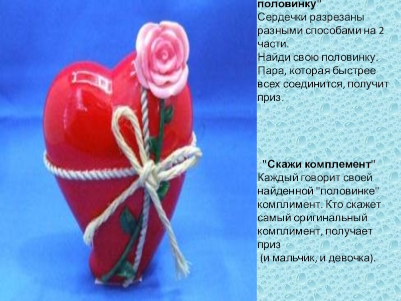Каждый говорит своей найденной "половинке" комплимент. Кто скажет самый оригинальный комплимент, получает приз