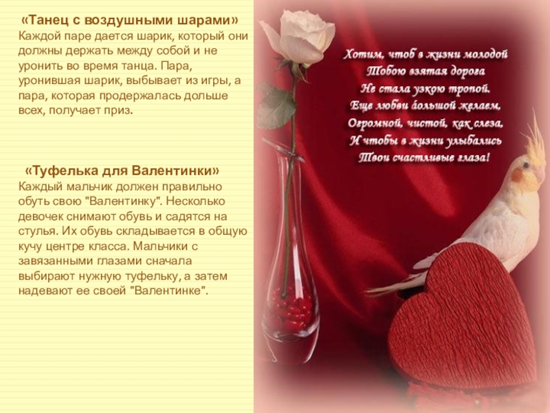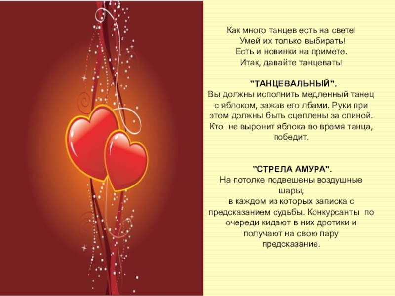 держать между собой и не уронить во время танца. Пара, уронившая шарик, выбывает из игры, а пара, которая продержалась дольше всех, получает приз.