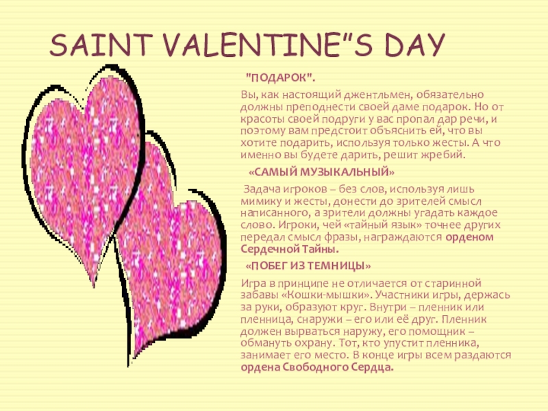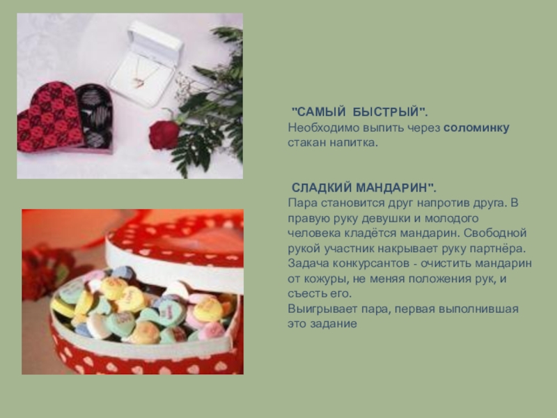 даме подарок. Но от красоты своей подруги у вас пропал дар речи, и поэтому вам предстоит объяснить ей, что вы хотите подарить, используя только жесты. А что именно вы будете дарить, решит жребий.