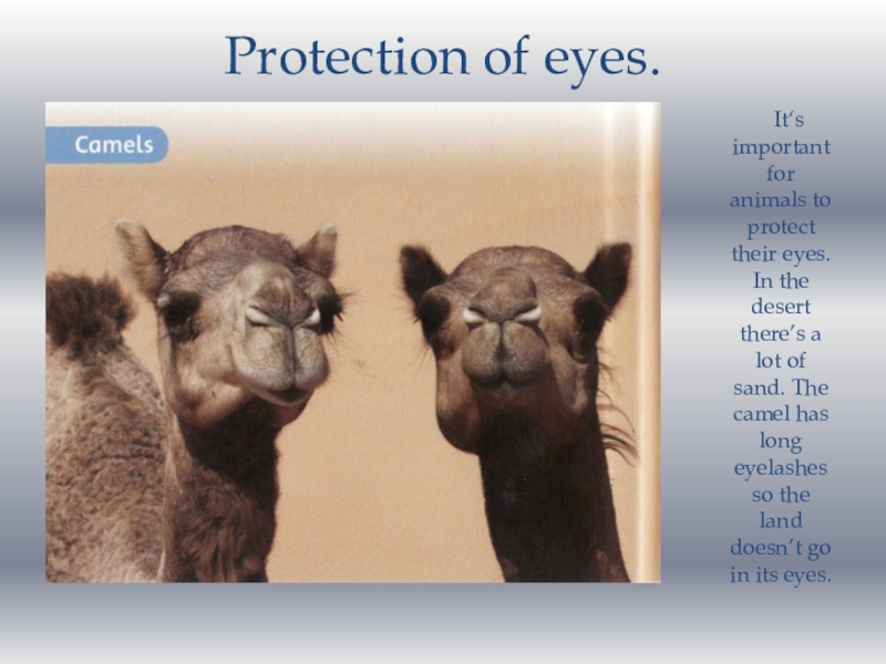 animals to protect their eyes. In the desert there’s a lot of sand. The camel has long eyelashes so the land doesn’t go in its eyes.