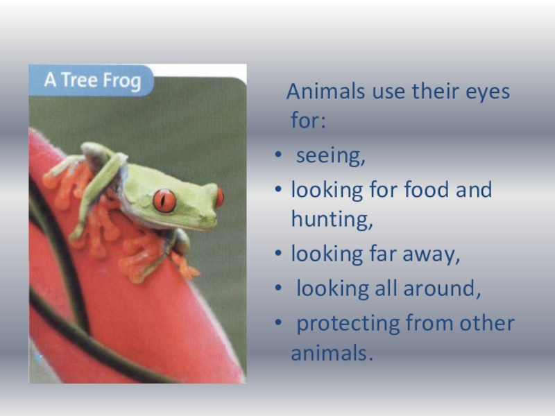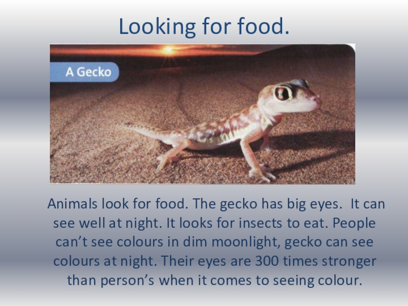 gecko has big eyes. It can see well at night. It looks for insects to eat. People can’t see colours in dim moonlight, gecko can see colours at night. Their eyes are 300 times stronger than person’s when it comes to seeing colour.