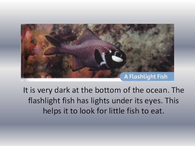 ocean. The flashlight fish has lights under its eyes. This helps it to look for little fish to eat.