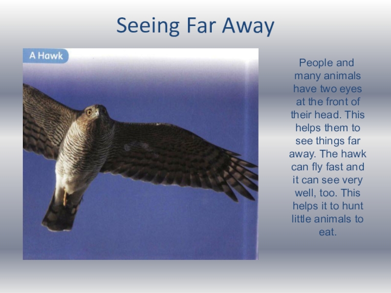 eyes at the front of their head. This helps them to see things far away. The hawk can fly fast and it can see very well, too. This helps it to hunt little animals to eat.