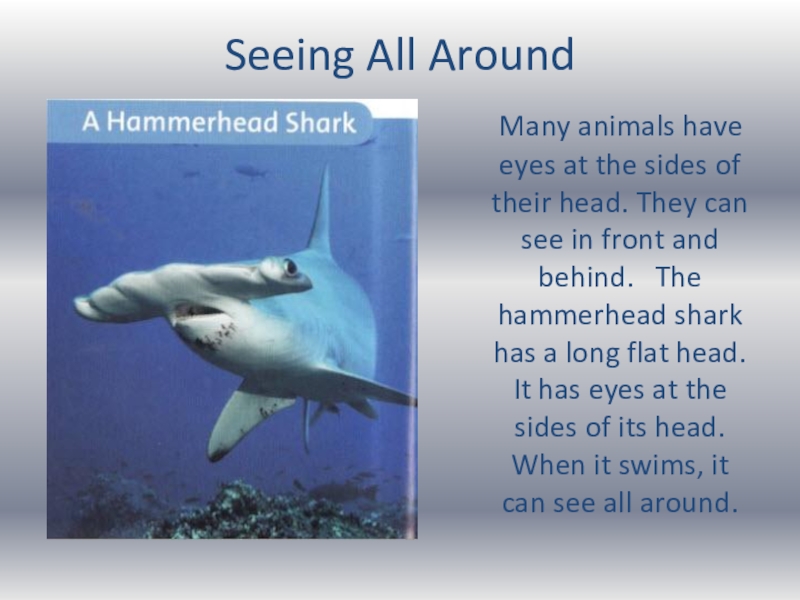 of their head. They can see in front and behind. The hammerhead shark has a long flat head. It has eyes at the sides of its head. When it swims, it can see all around.