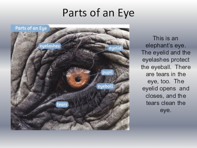 The eyelid and the eyelashes protect the eyeball. There are tears in the eye, too. The eyelid opens and closes, and the tears clean the eye.