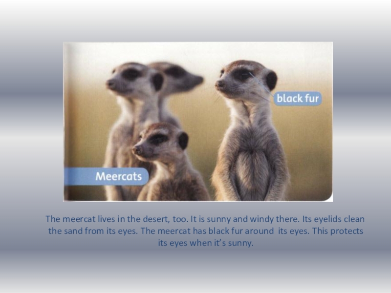 is sunny and windy there. Its eyelids clean the sand from its eyes. The meercat has black fur around its eyes. This protects its eyes when it’s sunny.