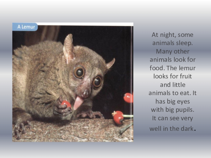 look for food. The lemur looks for fruit and little animals to eat. It has big eyes with big pupils. It can see very well in the dark.