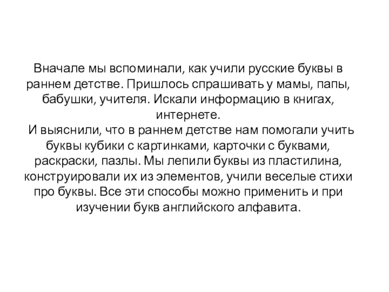 Слайд 12Вначале мы вспоминали, как учили русские буквы в раннем детстве. Пришлось
