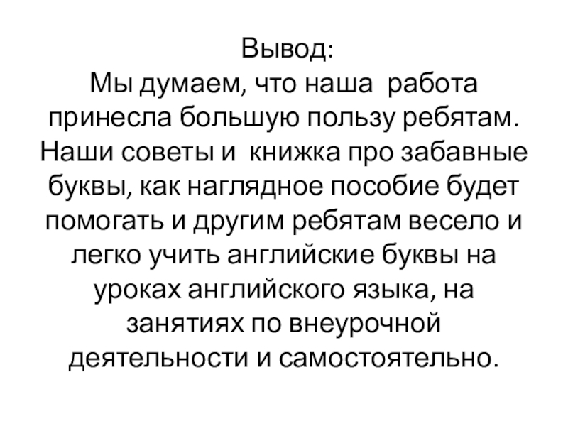 советы и книжка про забавные буквы, как наглядное пособие будет помогать и другим ребятам весело и легко учить английские буквы на уроках английского языка, на занятиях по внеурочной деятельности и самостоятельно.