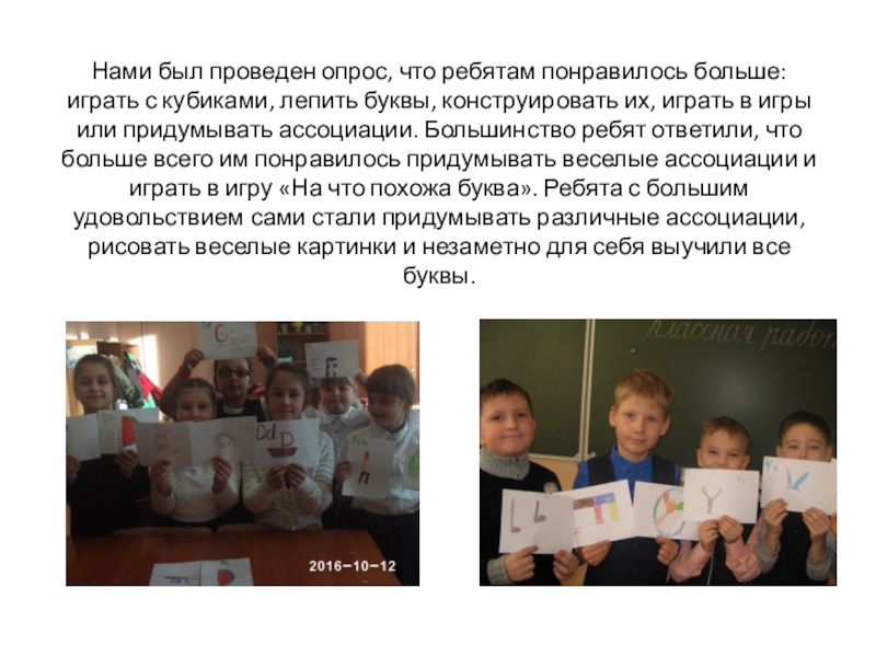 лепить буквы, конструировать их, играть в игры или придумывать ассоциации. Большинство ребят ответили, что больше всего им понравилось придумывать веселые ассоциации и играть в игру «На что похожа буква». Ребята с большим удовольствием сами стали придумывать различные ассоциации, рисовать веселые картинки и незаметно для себя выучили все буквы.