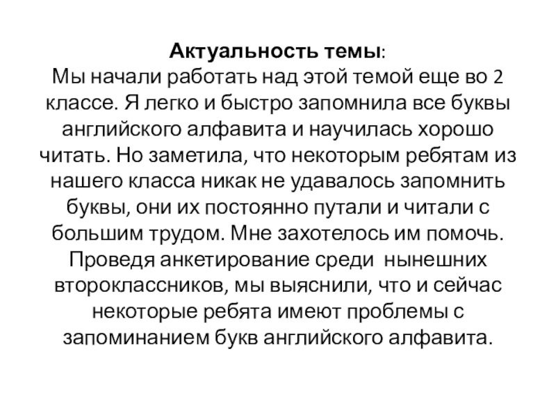 Проведя анкетирование среди нынешних второклассников, мы выяснили, что и сейчас некоторые ребята имеют проблемы с запоминанием букв английского алфавита.