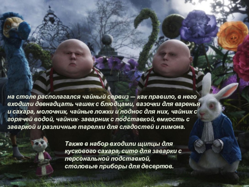 Также в набор входили щипцы для кускового сахара, сито для заварки с персональной подставкой, столовые приборы для десертов.