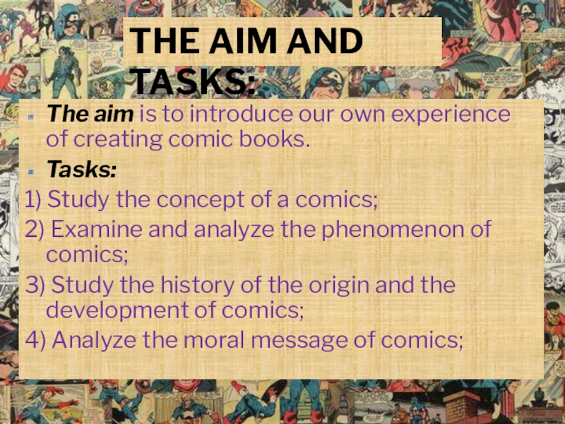 THE AIM AND TASKS:The aim is to introduce our own experience of creating comic books.Tasks:1) Study the concept of a comics;2) Examine and analyze the phenomenon of comics;3) Study the history of the origin and the