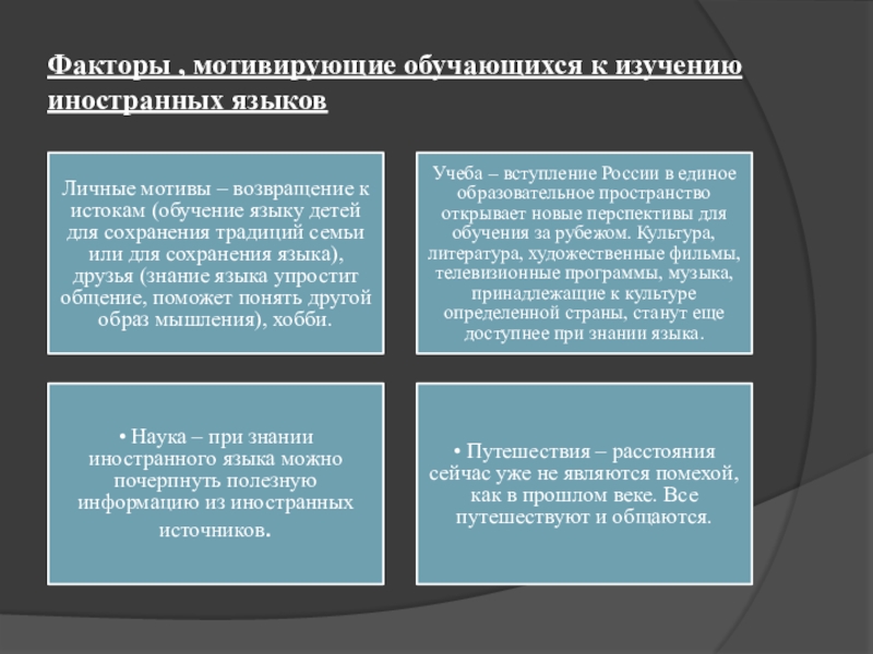 Слайд 9Факторы , мотивирующие обучающихся к изучению иностранных языков