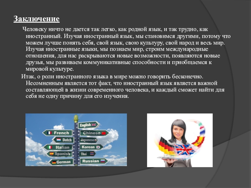 и так трудно, как иностранный. Изучая иностранный язык, мы становимся другими, потому что можем лучше понять себя, свой язык, свою культуру, свой народ и весь мир. Изучая иностранные языки, мы познаем мир, строим международные отношения, для нас раскрываются новые возможности, появляются новые друзья, мы развиваем коммуникативные способности и приобщаемся к мировой культуре.