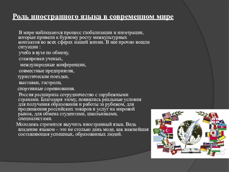 Россия расширила сотрудничество с зарубежными странами. Благодаря этому, появились реальные условия для получения образования и работы за рубежом, для продвижения российских товаров и услуг на мировой рынок, для обмена студентами, школьниками, специалистами.