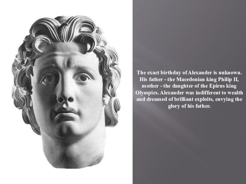 Слайд 2The exact birthday of Alexander is unknown. His father - the