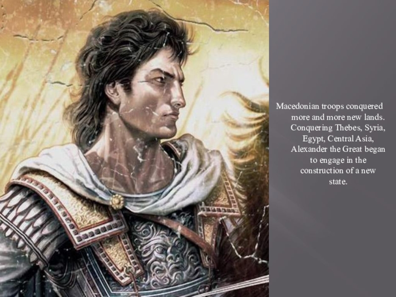 Macedonian troops conquered more and more new lands. Conquering Thebes, Syria, Egypt, Central Asia, Alexander the Great