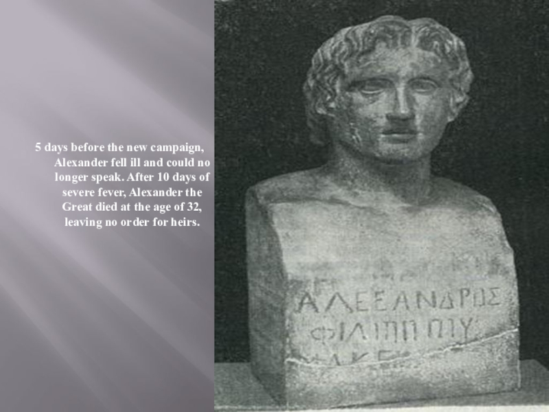 Слайд 75 days before the new campaign, Alexander fell ill and could
