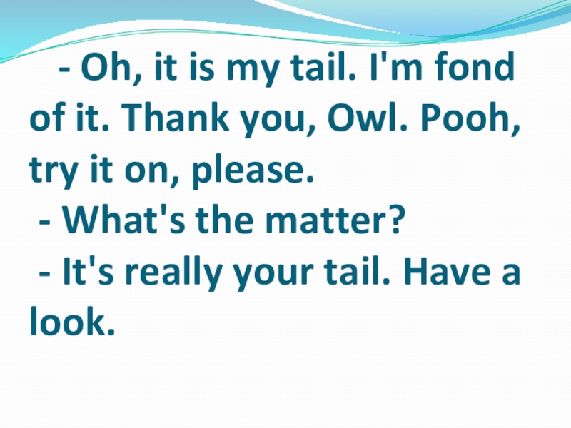 - Oh, it is my tail. I'm fond of it. Thank you, Owl. Pooh, try it on, please. - What's the matter? - It's really your tail. Have a look.