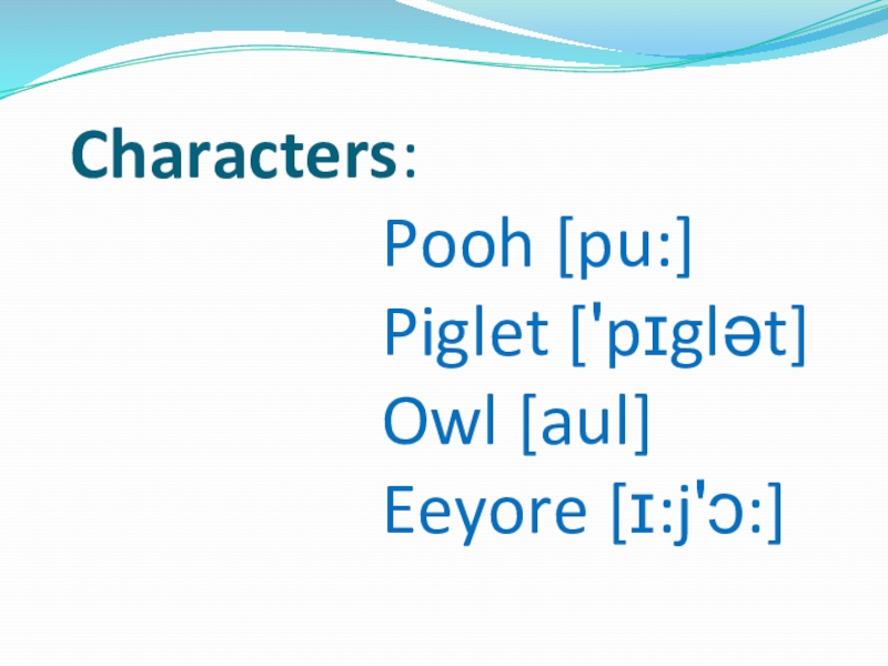 Pooh [pu:] Piglet [ʹpɪglət] Owl [aul] Eeyore [ɪ:jʹɔ:]