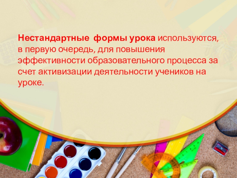 Нестандартные формы урока используются, в первую очередь, для повышения эффективности образовательного процесса за счет активизации деятельности учеников на