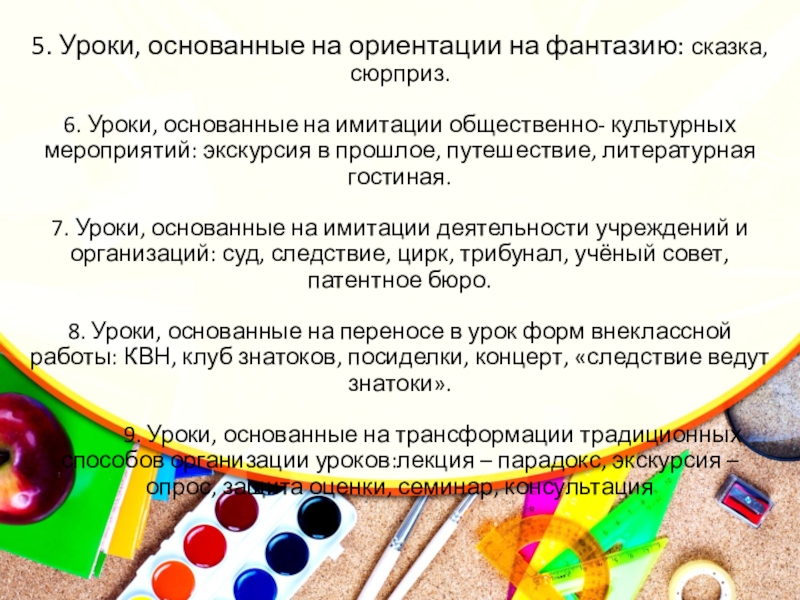5. Уроки, основанные на ориентации на фантазию: сказка, сюрприз.  6. Уроки, основанные на имитации общественно- культурных