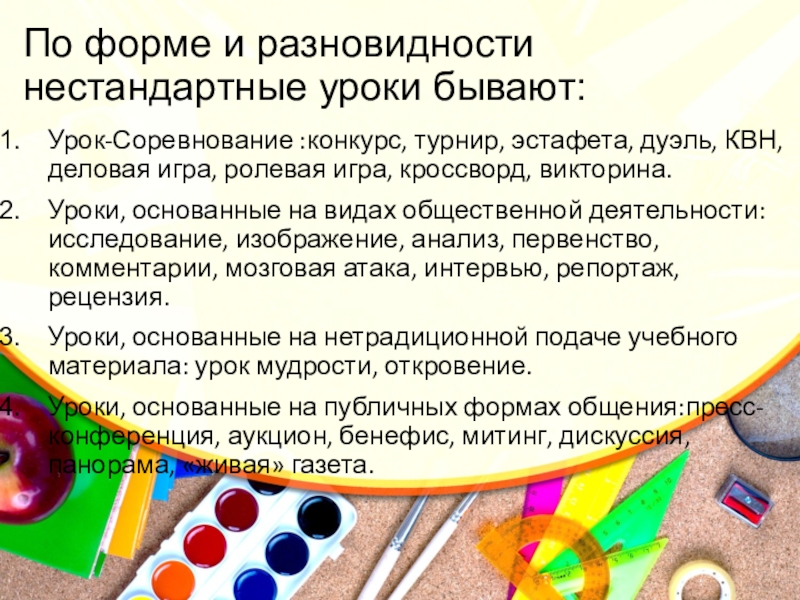 Слайд 3По форме и разновидности нестандартные уроки бывают: