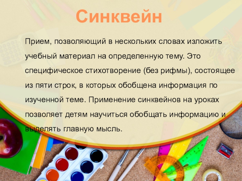 СинквейнПрием, позволяющий в нескольких словах изложить учебный материал на определенную тему. Это специфическое стихотворение (без рифмы), состоящее