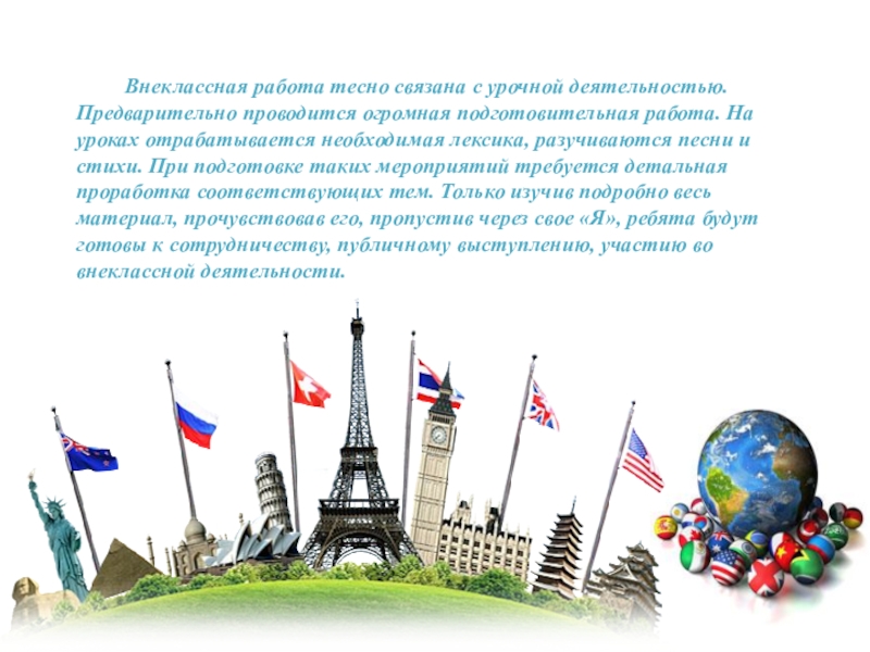деятельностью. Предварительно проводится огромная подготовительная работа. На уроках отрабатывается необходимая лексика, разучиваются песни и стихи. При подготовке таких мероприятий требуется детальная проработка соответствующих тем. Только изучив подробно весь материал, прочувствовав его, пропустив через свое «Я», ребята будут готовы к сотрудничеству, публичному выступлению, участию во внеклассной деятельности.