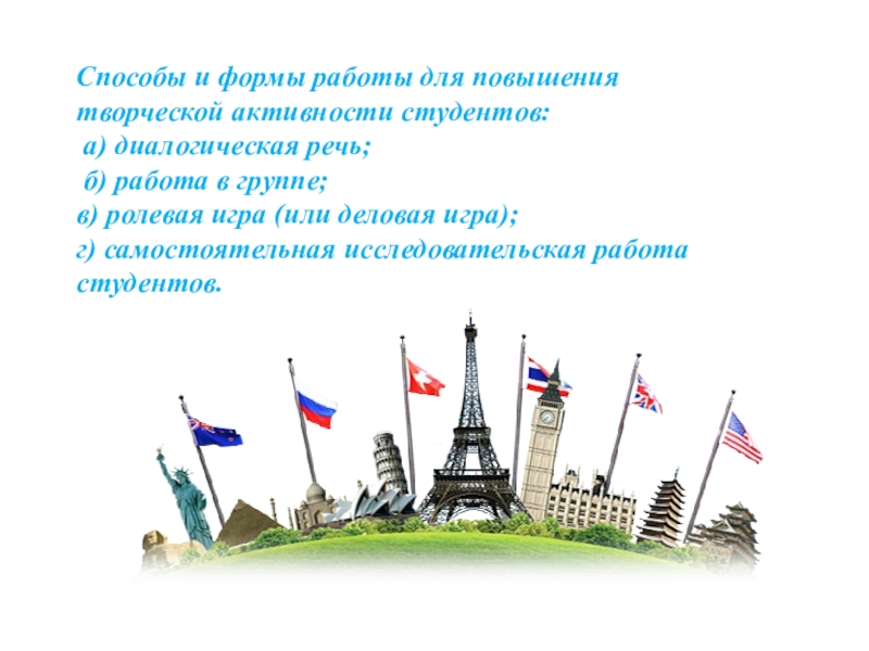 Слайд 10Способы и формы работы для повышения творческой активности студентов: