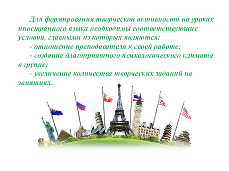 Слайд 7Для формирования творческой активности на уроках иностранного языка необходимы соответствующие условия,