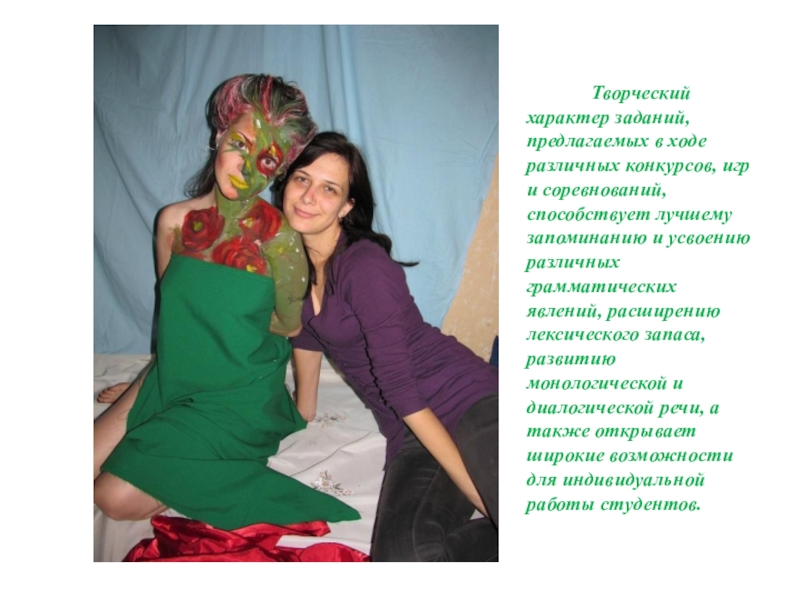 в ходе различных конкурсов, игр и соревнований, способствует лучшему запоминанию и усвоению различных грамматических явлений, расширению лексического запаса, развитию монологической и диалогической речи, а также открывает широкие возможности для индивидуальной работы студентов.