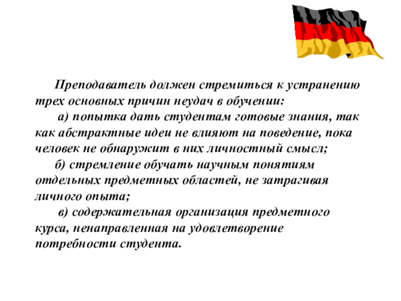 Слайд 6Преподаватель должен стремиться к устранению трех основных причин неудач в обучении: