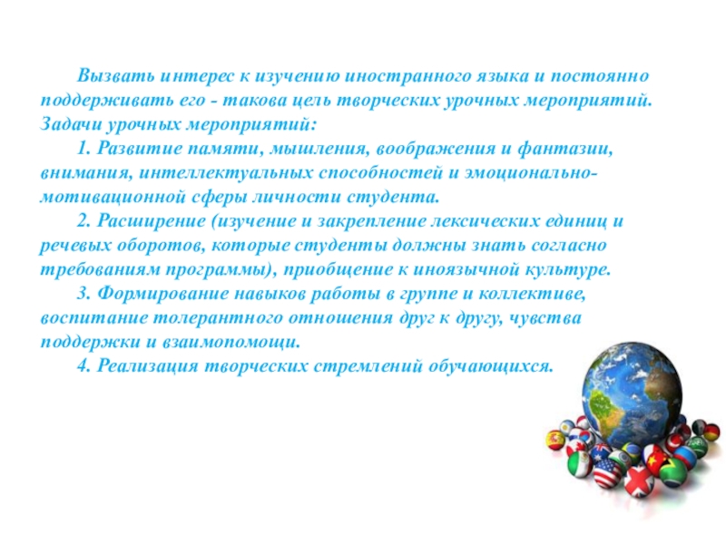 2. Расширение (изучение и закрепление лексических единиц и речевых оборотов, которые студенты должны знать согласно требованиям программы), приобщение к иноязычной культуре.
