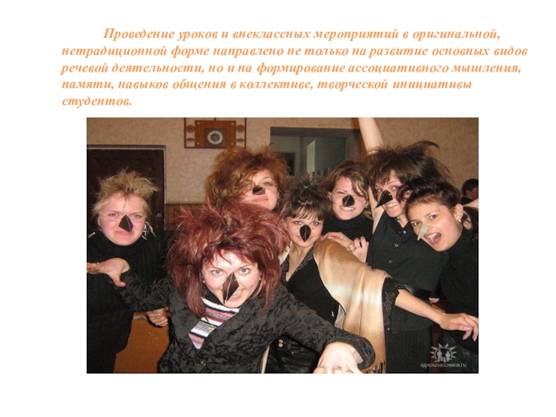в оригинальной, нетрадиционной форме направлено не только на развитие основных видов речевой деятельности, но и на формирование ассоциативного мышления, памяти, навыков общения в коллективе, творческой инициативы студентов.