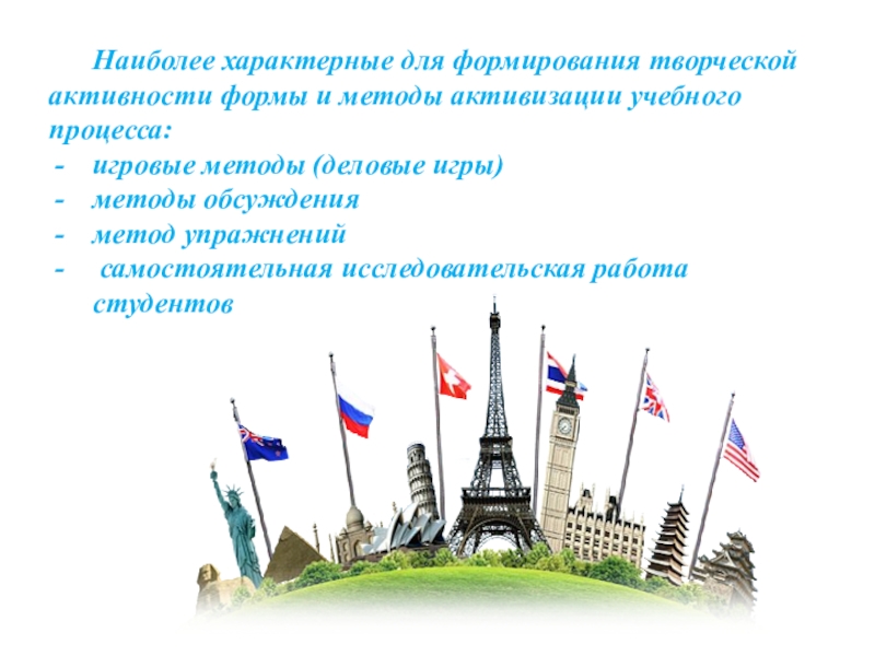 Слайд 9Наиболее характерные для формирования творческой активности формы и методы активизации учебного