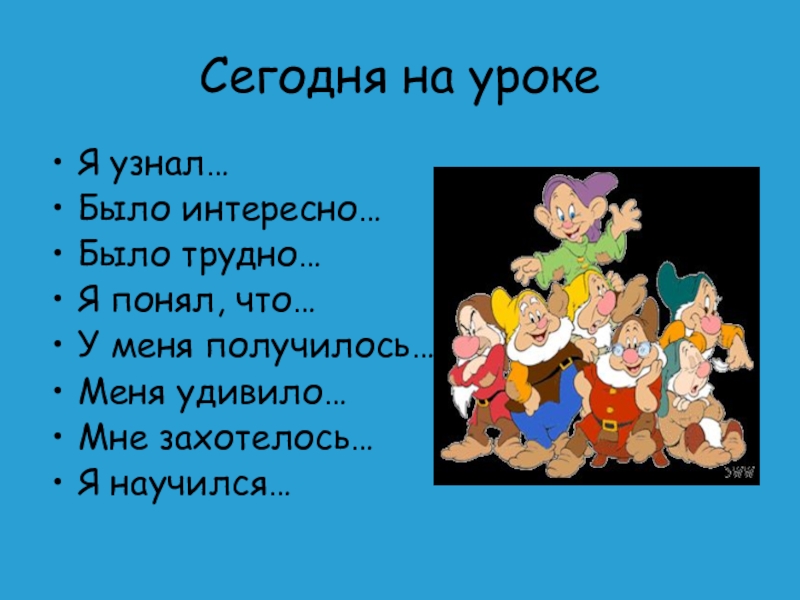 Сегодня на урокеЯ узнал…Было интересно…Было трудно…Я понял, что…У меня получилось…Меня удивило…Мне захотелось…Я научился…