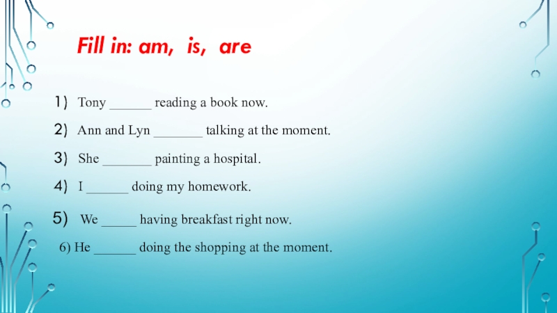 Fill in: am, is, are Tony ______ reading a book now. Ann and Lyn _______ talking at