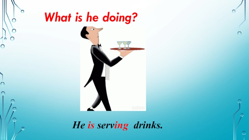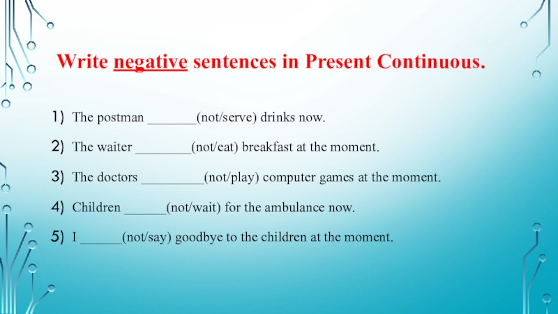 Write negative sentences in Present Continuous.The postman _______(not/serve) drinks now.The waiter ________(not/eat) breakfast at the moment.The doctors