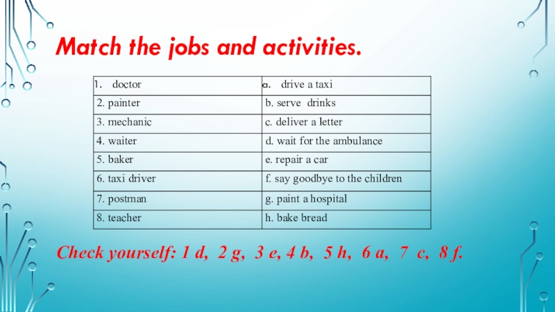 Match the jobs and activities. Check yourself: 1 d, 2 g, 3 e, 4 b, 5 h,
