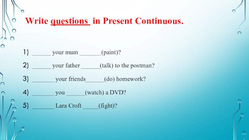 Write questions in Present Continuous. ______ your mum _______(paint)?______ your father ______(talk) to the postman?_______ your friends______(do)