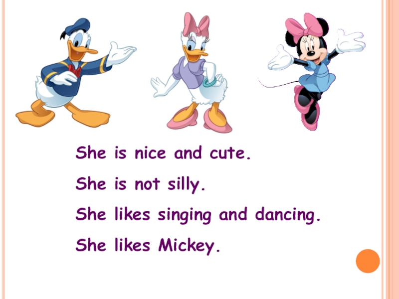 She is nice and cute.She is not silly.She likes singing and dancing.She likes Mickey.
