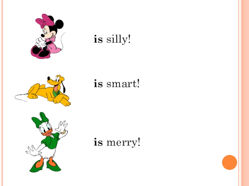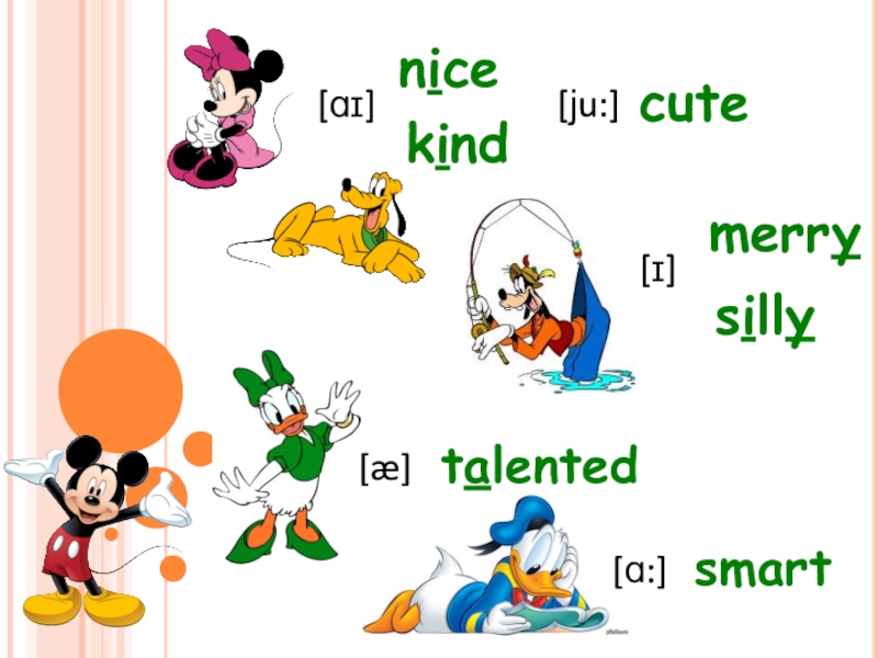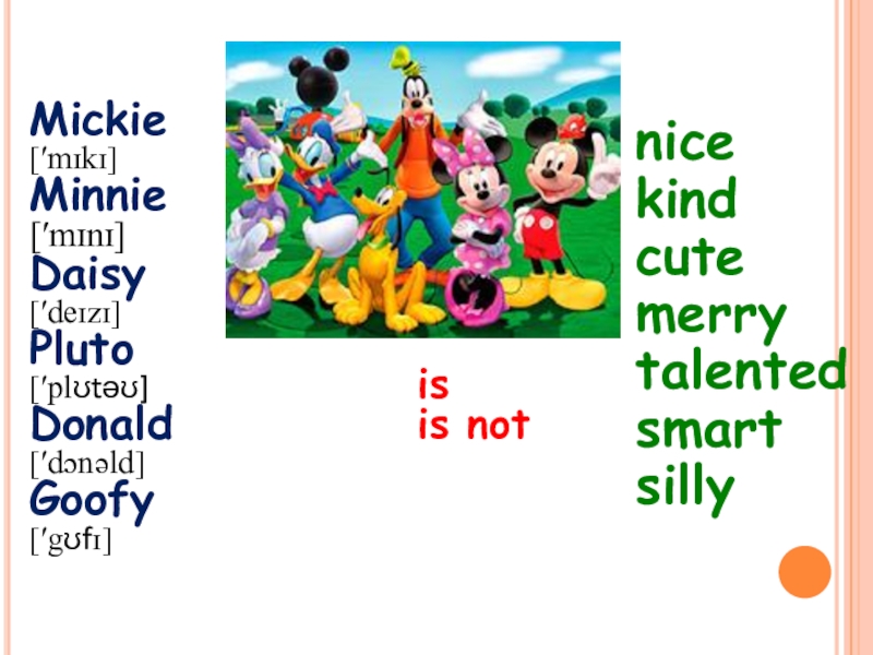 nicekindcutemerrytalentedsmartsillyisis notMickie[ʹmɪkɪ]Minnie[ʹmɪnɪ]Daisy[ʹdeɪzɪ]Pluto[ʹplʊtəʊ]Donald[ʹdɔnəld]Goofy[ʹgʊfɪ]