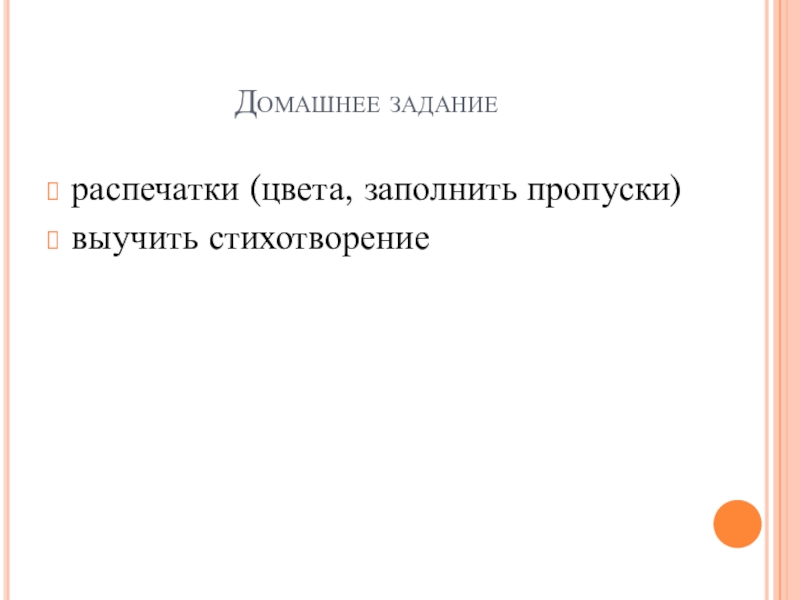 Домашнее заданиераспечатки (цвета, заполнить пропуски)выучить стихотворение