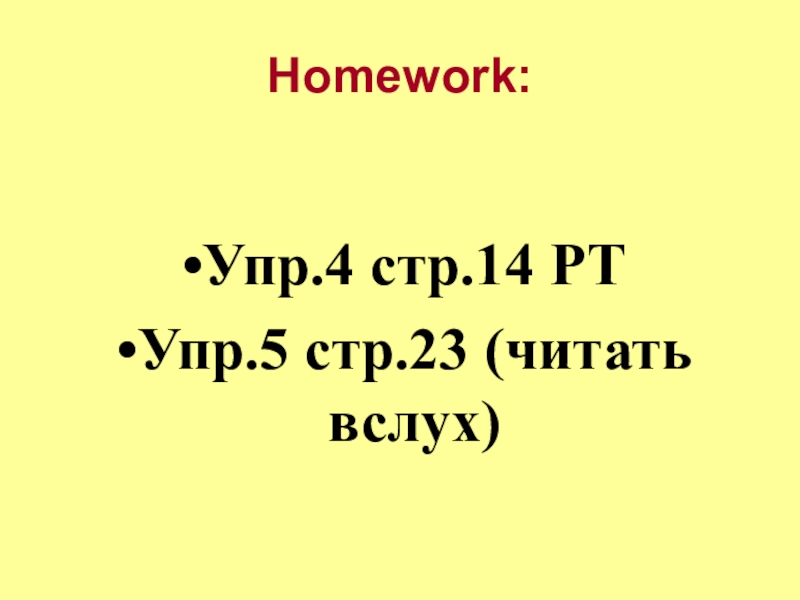 Homework:Упр.4 стр.14 РТУпр.5 стр.23 (читать вслух)