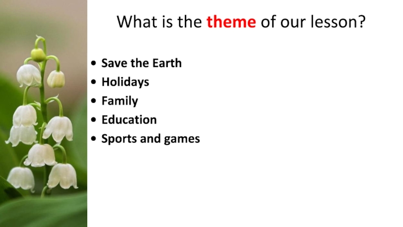 What is the theme of our lesson?Save the EarthHolidaysFamilyEducationSports and games