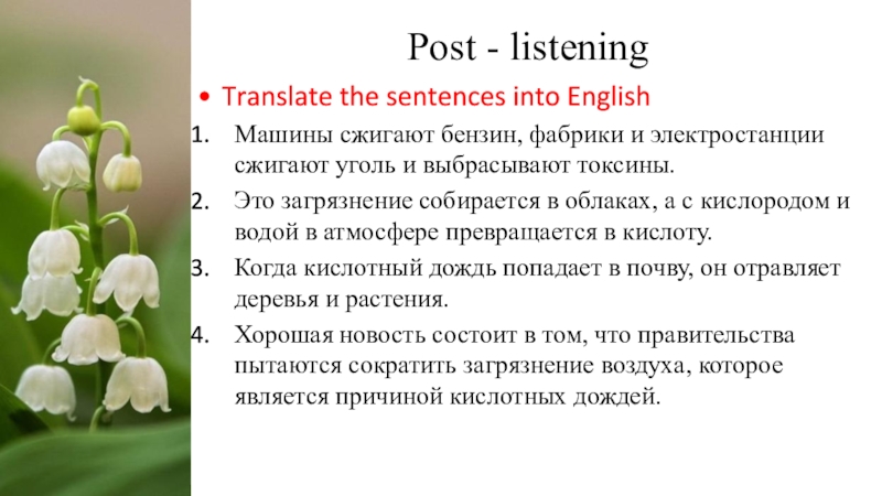 Post - listeningTranslate the sentences into EnglishМашины сжигают бензин, фабрики и электростанции сжигают уголь и выбрасывают токсины.Это