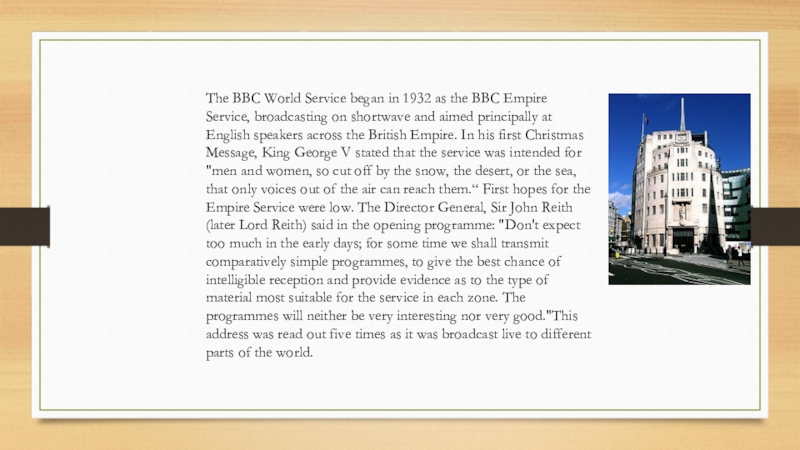 Service, broadcasting on shortwave and aimed principally at English speakers across the British Empire. In his first Christmas Message, King George V stated that the service was intended for "men and women, so cut off by the snow, the desert, or the sea, that only voices out of the air can reach them.“ First hopes for the Empire Service were low. The Director General, Sir John Reith (later Lord Reith) said in the opening programme: "Don't expect too much in the early days; for some time we shall transmit comparatively simple programmes, to give the best chance of intelligible reception and provide evidence as to the type of material most suitable for the service in each zone. The programmes will neither be very interesting nor very good."This address was read out five times as it was broadcast live to different parts of the world.