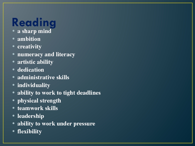 Readinga sharp mindambitioncreativitynumeracy and literacyartistic abilitydedicationadministrative skillsindividualityability to work to tight deadlinesphysical strengthteamwork skillsleadershipability to work under pressureflexibility
